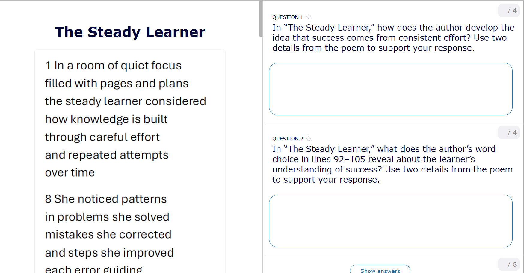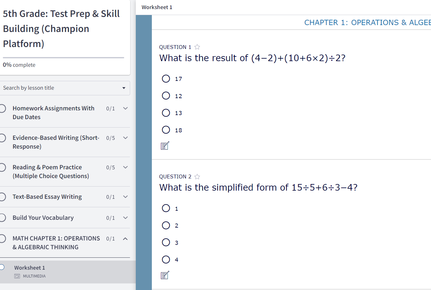 Champion: 5th Grade Test Prep & Skill Building (Math & ELA) is a structured program designed to help students master essential academic skills and excel on the NYS state exams. This course focuses on strengthening reading comprehension, evidence-based writing, and problem-solving through carefully designed lessons, real test-style questions, and timed practice. Students develop critical thinking, accuracy, and confidence while learning how to approach exams strategically. With a balanced combination of Math and ELA, including reading passages, poetry analysis, and written responses, Champion prepares students for long-term academic success. Ideal for 5th-grade students in NYC seeking strong foundations and measurable improvement in school performance and standardized testing.