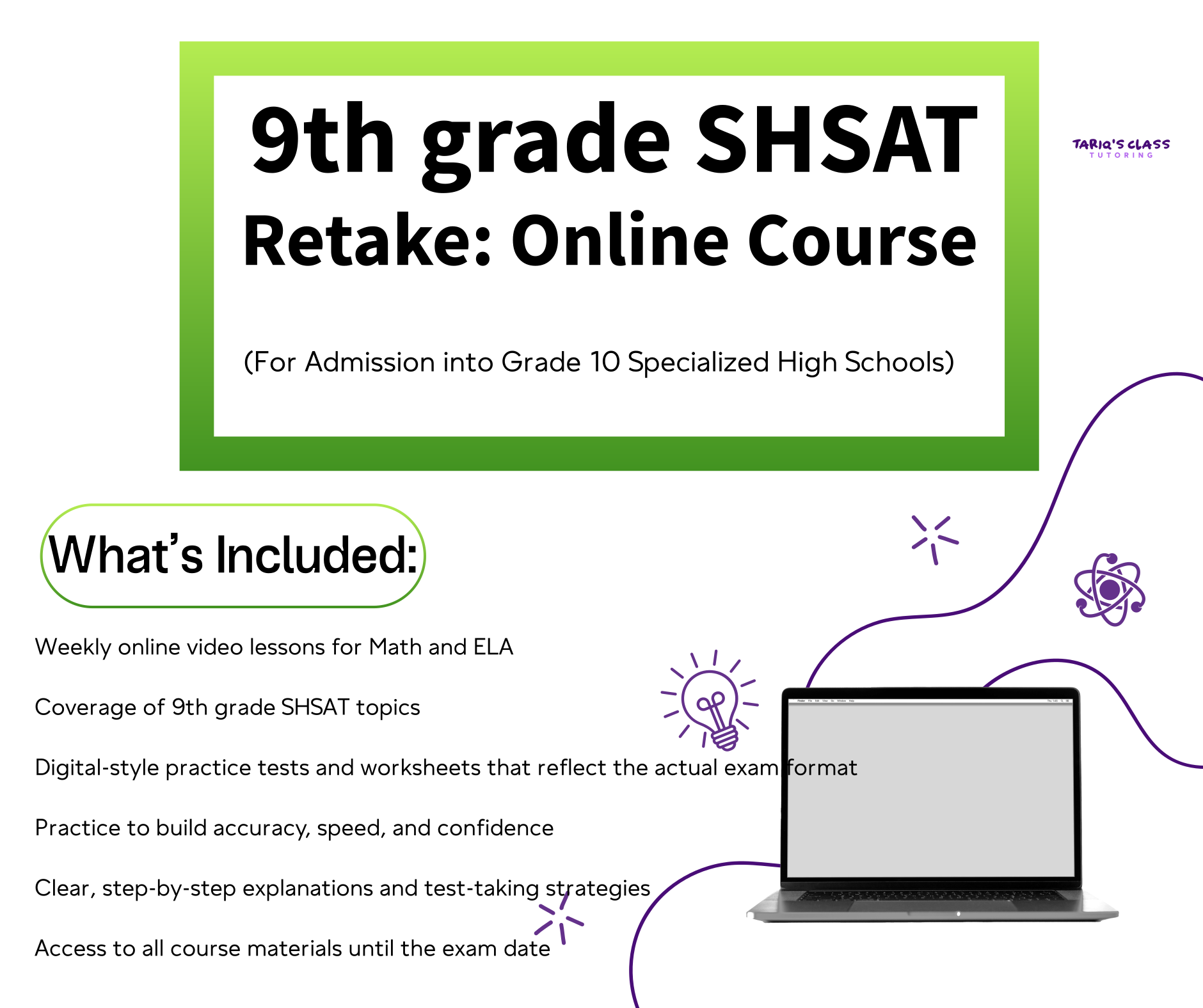 9th Grade SHSAT: Retake For Admission into Grade 10 Specialized High Schools This online course is designed for students who plan to retake the SHSAT for admission into Grade 10 specialized high schools. Although the exam is taken at the beginning of 9th grade, students should start preparing immediately after receiving their 8th grade SHSAT results. If a student does not gain admission to their desired specialized high school, beginning preparation right away—while still in 8th grade—provides a strong advantage. This course offers structured, guided preparation to help students use this critical time effectively. What This Course Includes Weekly online video lessons for Math and ELA Coverage of 9th grade SHSAT topics Digital-style practice tests and worksheets that reflect the actual exam format Practice to build accuracy, speed, and confidence Clear, step-by-step explanations and test-taking strategies Access to all course materials until the exam date Who This Course Is For Students planning to retake the SHSAT in 9th grade Students seeking admission into Grade 10 specialized high schools 8th grade students who want to start preparation early Families looking for a structured online SHSAT retake program This course provides consistent instruction, realistic practice, and focused strategy—so students are fully prepared when the 9th grade SHSAT arrives. This course is not affiliated with or endorsed by the NYC Department of Education.